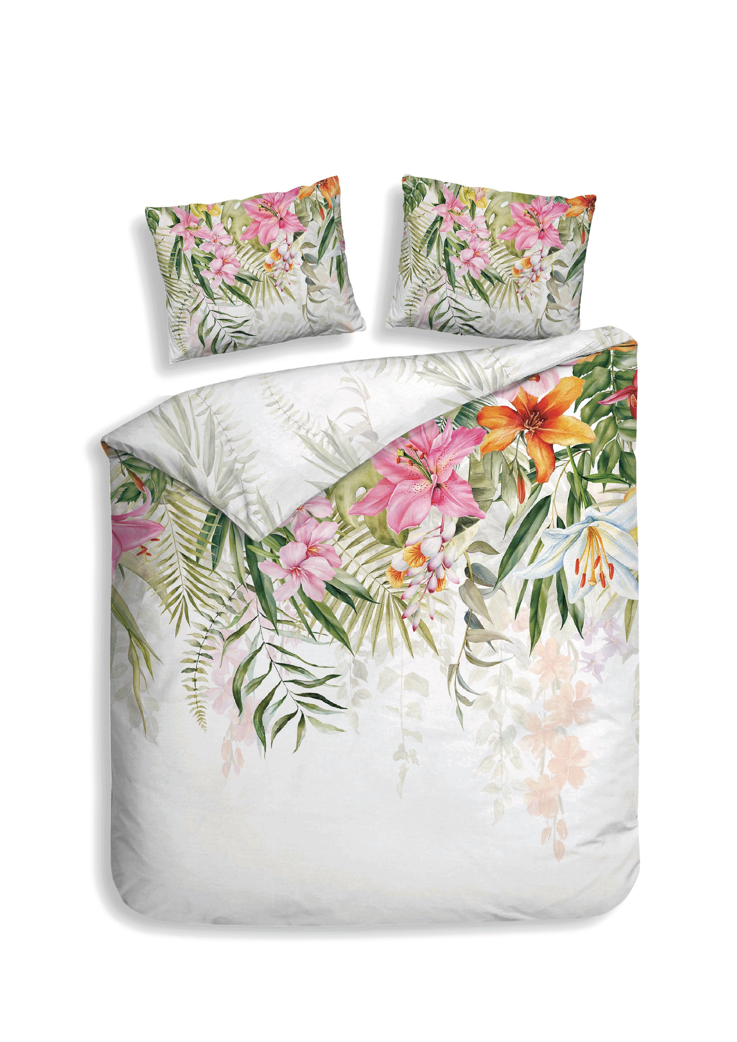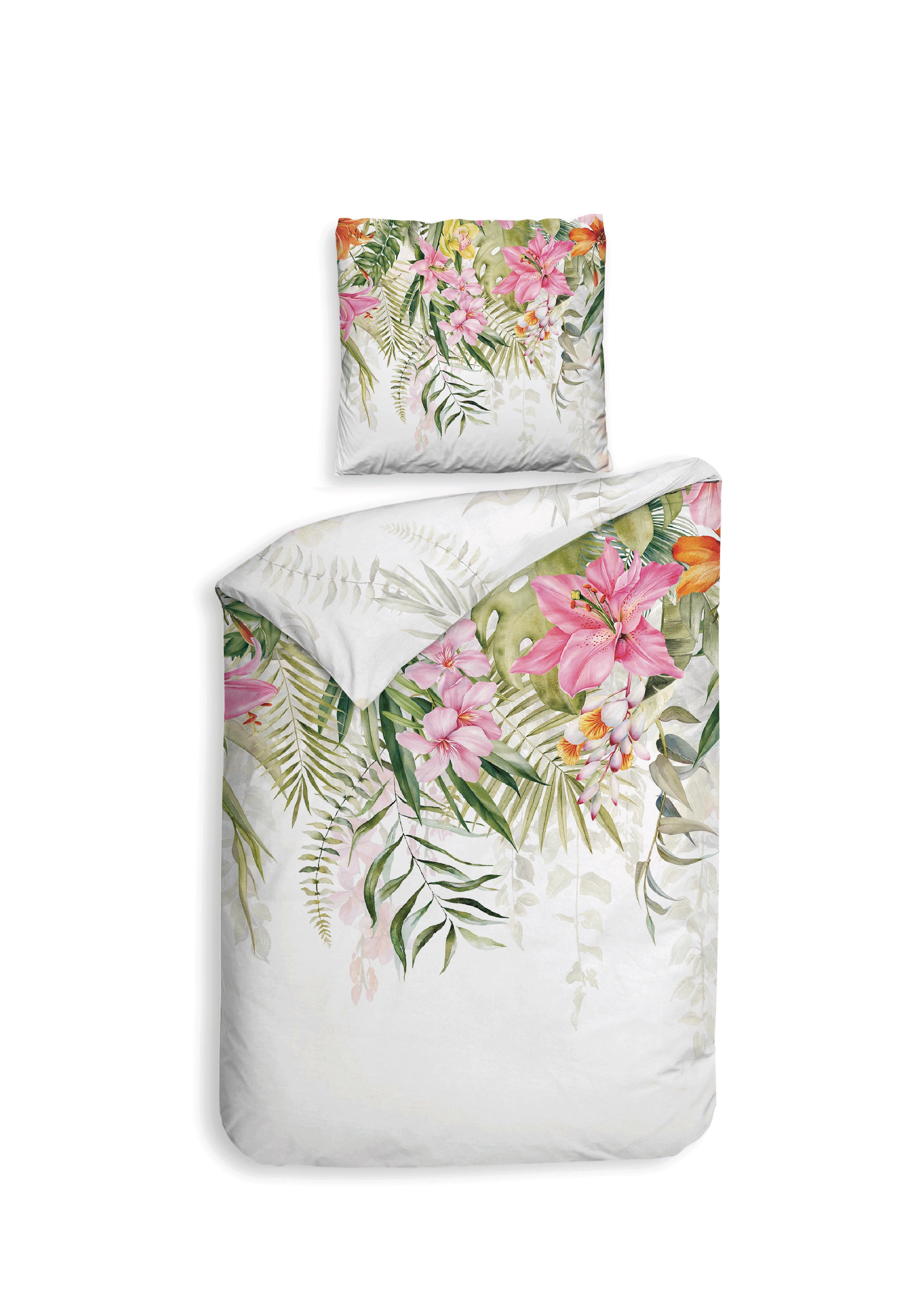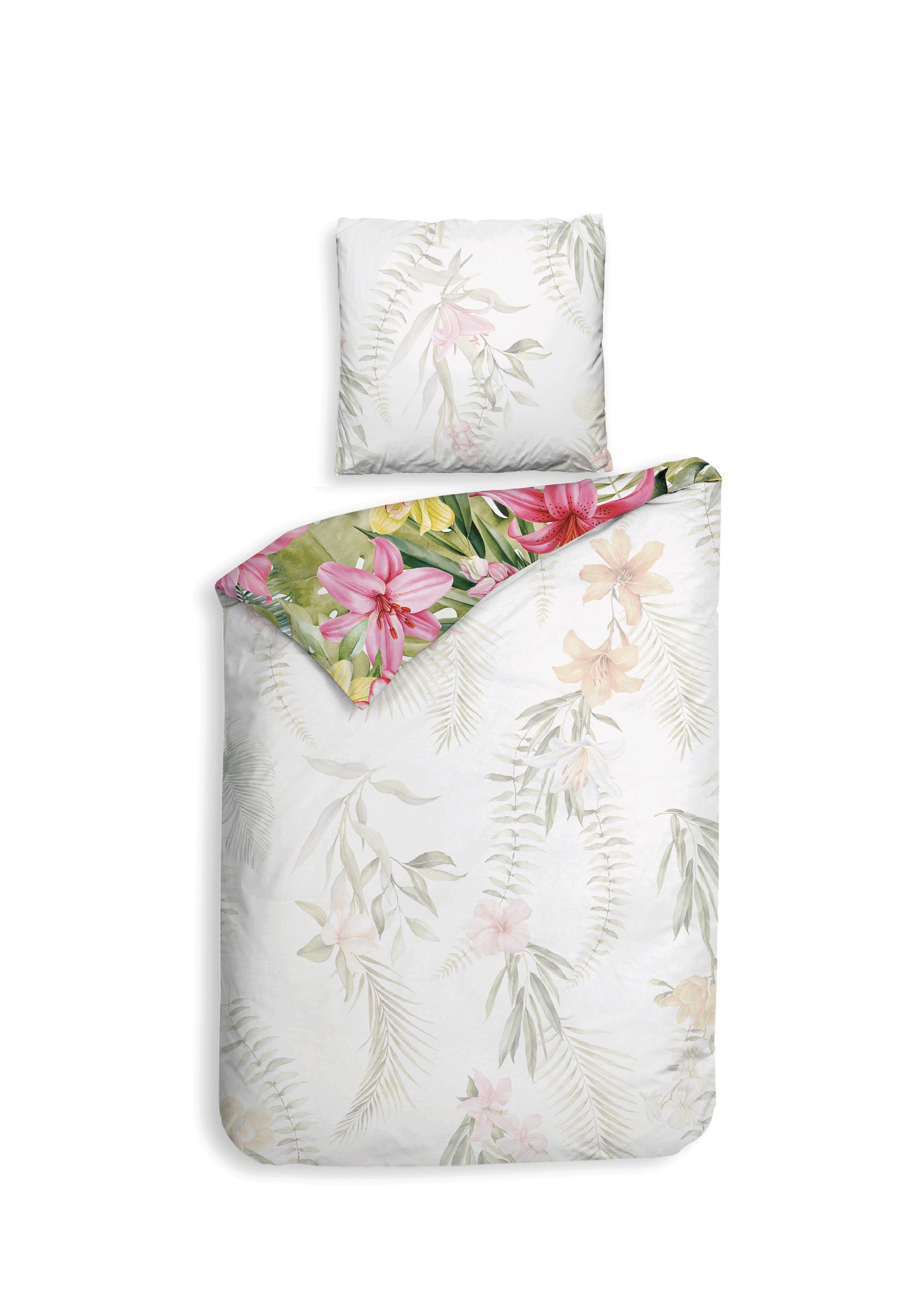 Met dekbedovertrek Talia haal je de rust en frisheid van Palm Beach in huis. Op een witte achtergrond staan bloemen en bladeren in zachte groen- en rozetinten, wat een luchtige en serene uitstraling geeft. Het 100% katoen-satijn voelt heerlijk zacht en comfortabel, en dankzij het dubbelzijdige dessin kun je eenvoudig variëren in look. Geleverd met bijpassende kussenslopen.