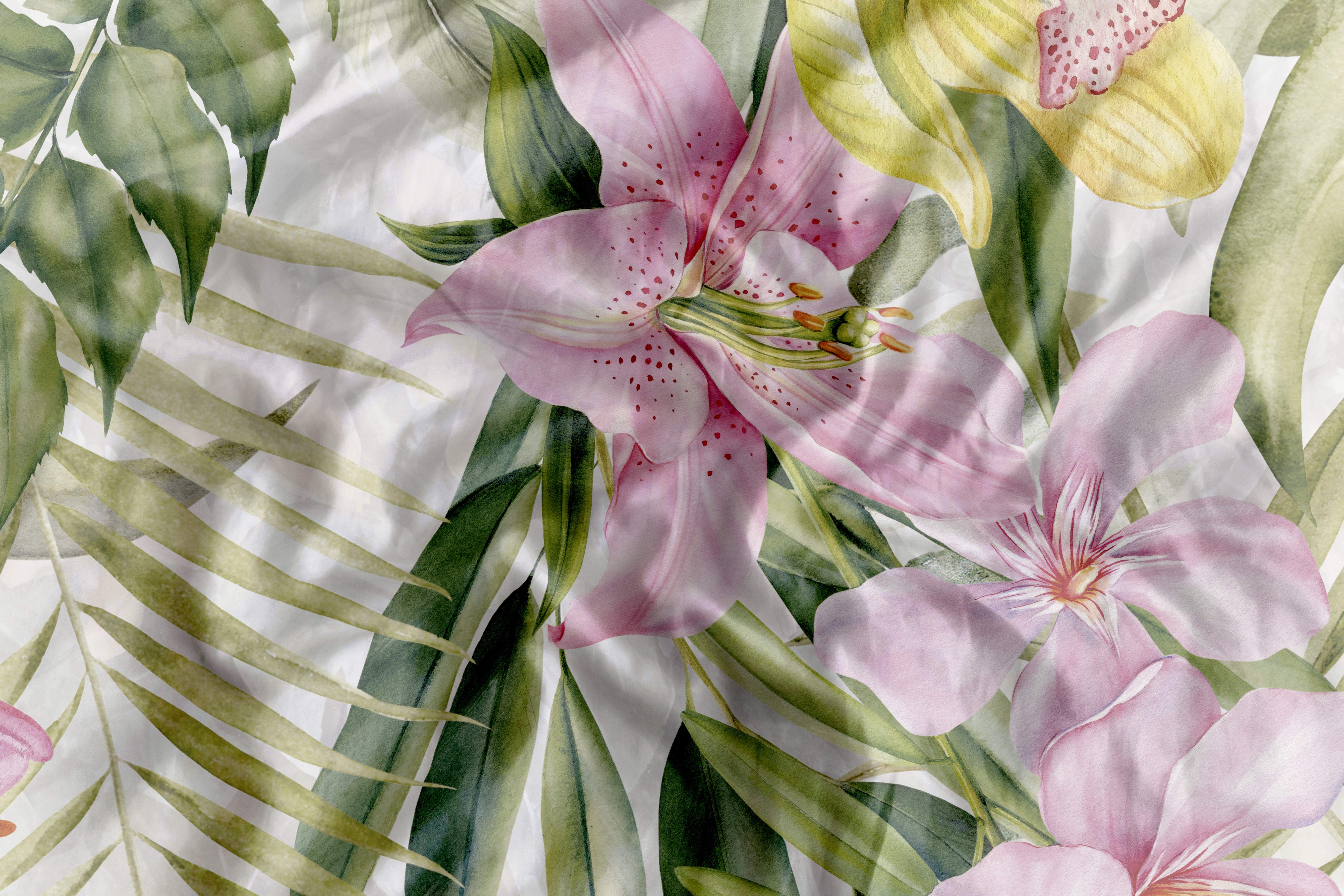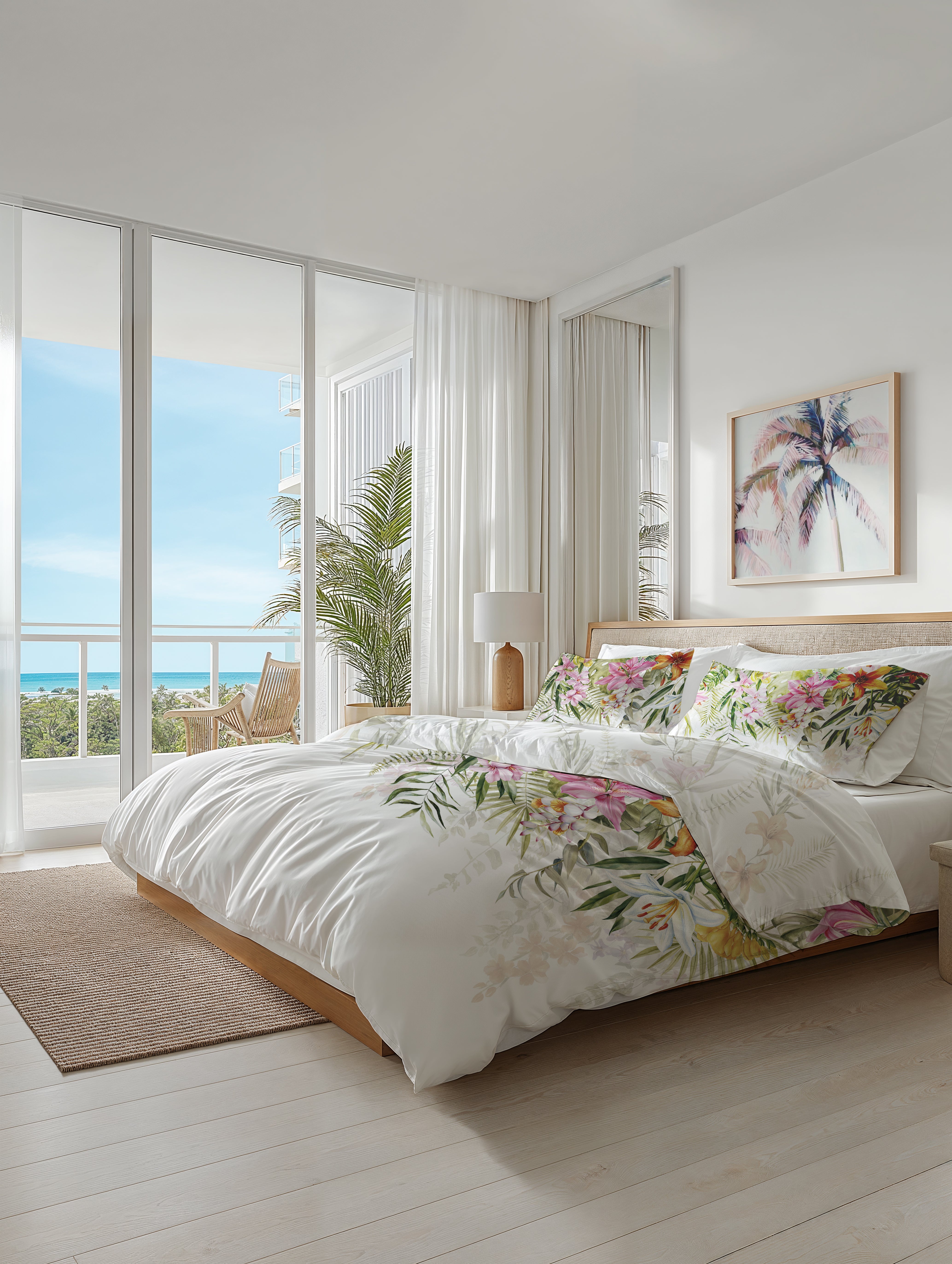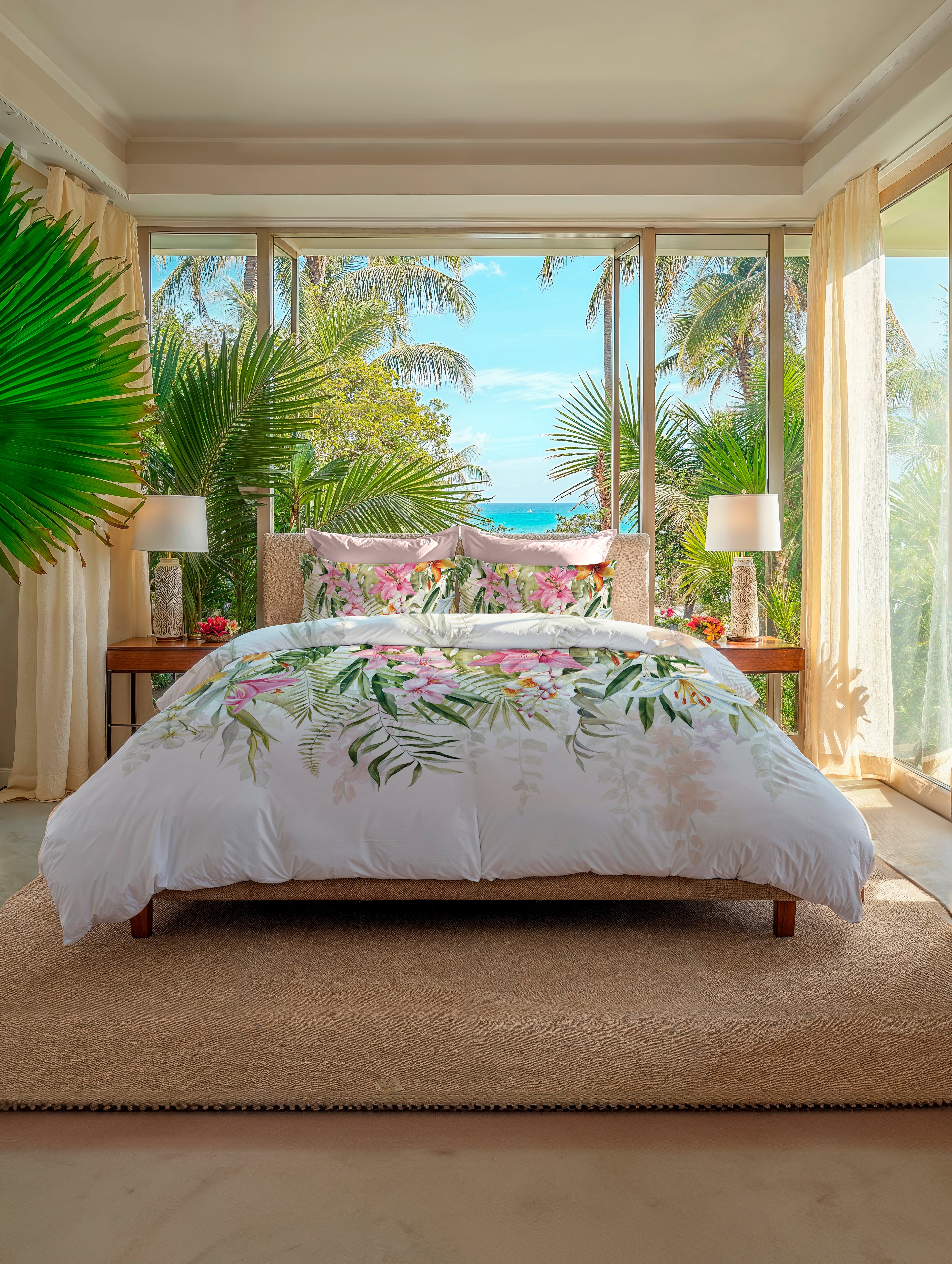 Met dekbedovertrek Talia haal je de rust en frisheid van Palm Beach in huis. Op een witte achtergrond staan bloemen en bladeren in zachte groen- en rozetinten, wat een luchtige en serene uitstraling geeft. Het 100% katoen-satijn voelt heerlijk zacht en comfortabel, en dankzij het dubbelzijdige dessin kun je eenvoudig variëren in look. Geleverd met bijpassende kussenslopen.