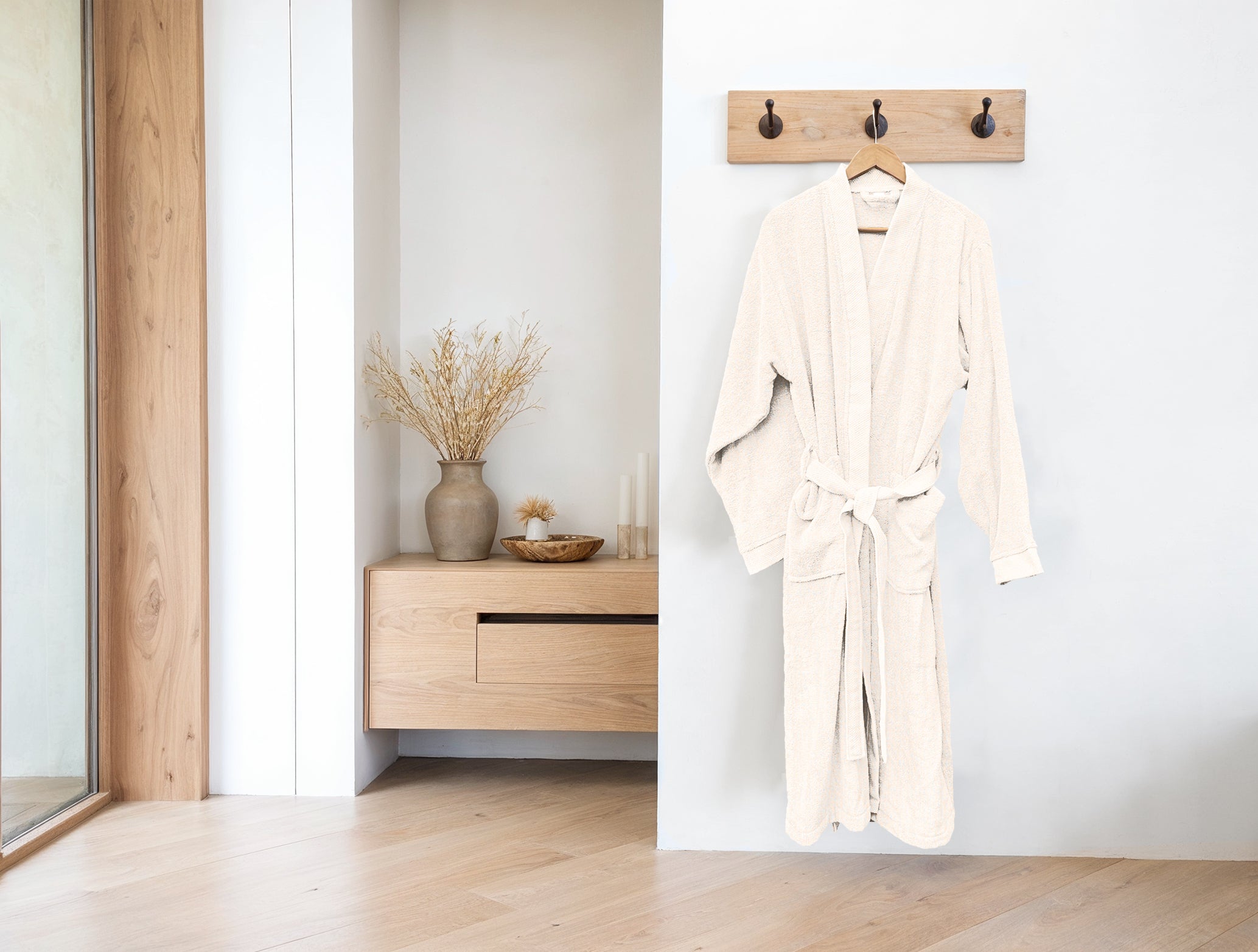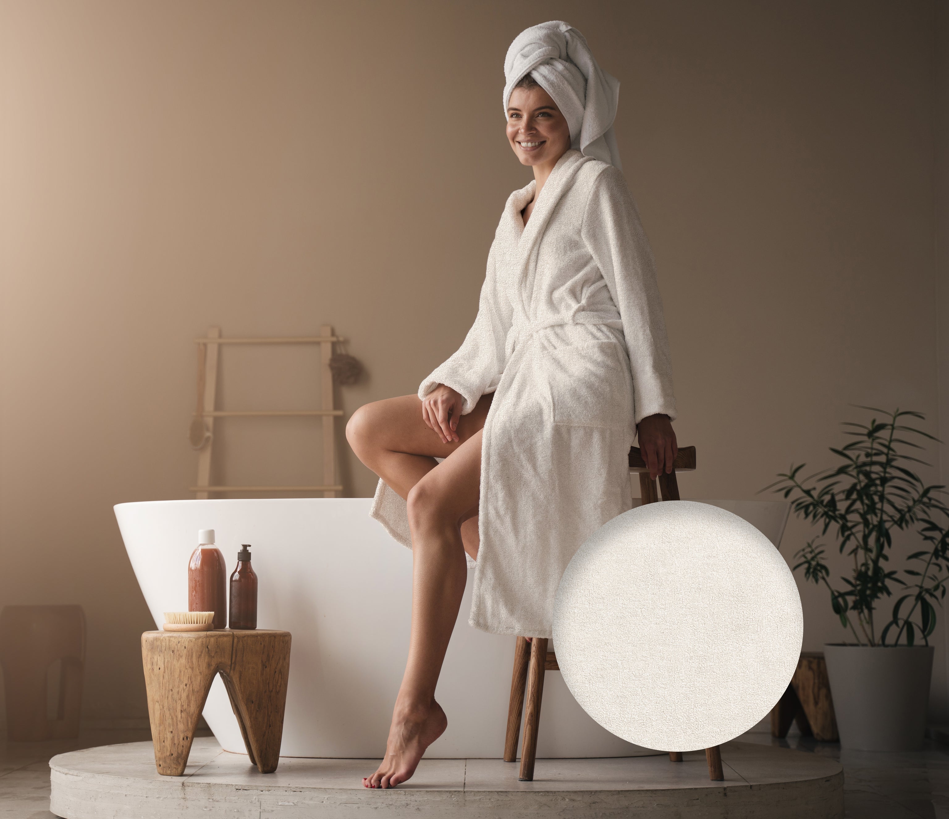 De Premium badjas van Heckettlane in tijdloos Off-white is gemaakt van 100% hoogwaardig katoen en voelt heerlijk zacht en ademend aan. Deze badjas biedt optimale warmte en comfort, perfect voor ontspannen momenten thuis of bijvoorbeeld na het douchen. Dankzij de duurzame stof blijft hij lang mooi, zelfs na veel wassen. Met een comfortabele pasvorm en handige zakken is deze badjas een stijlvolle en praktische toevoeging aan je garderobe. Ervaar het luxe wellnessgevoel van Heckettlane elke dag opnieuw.