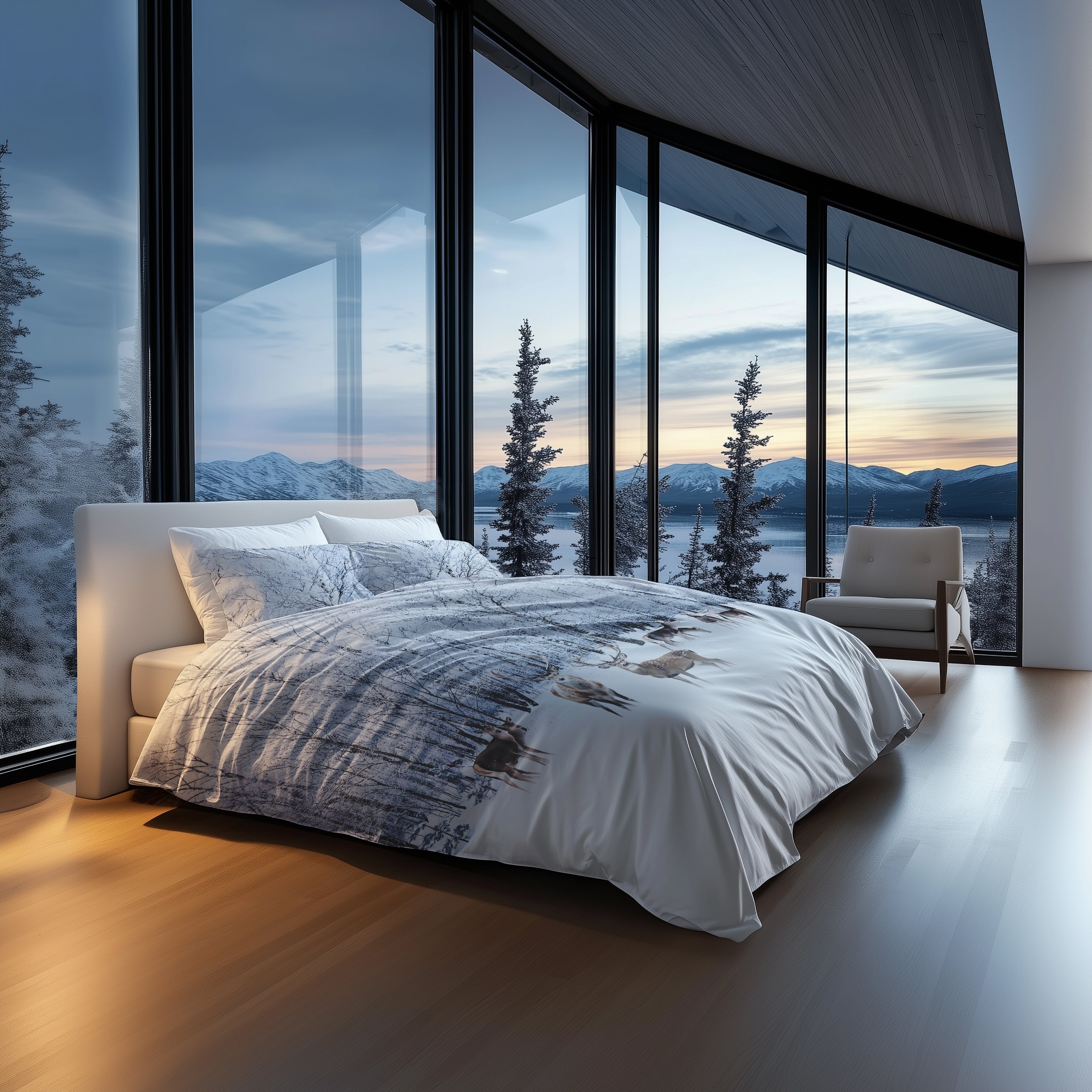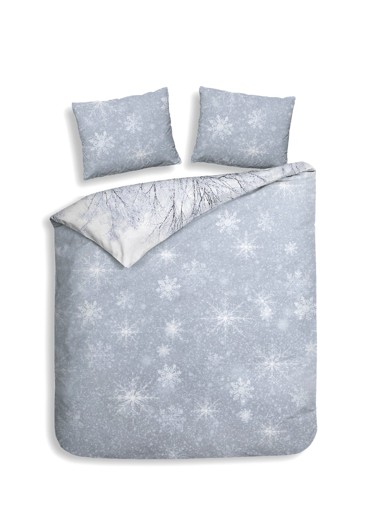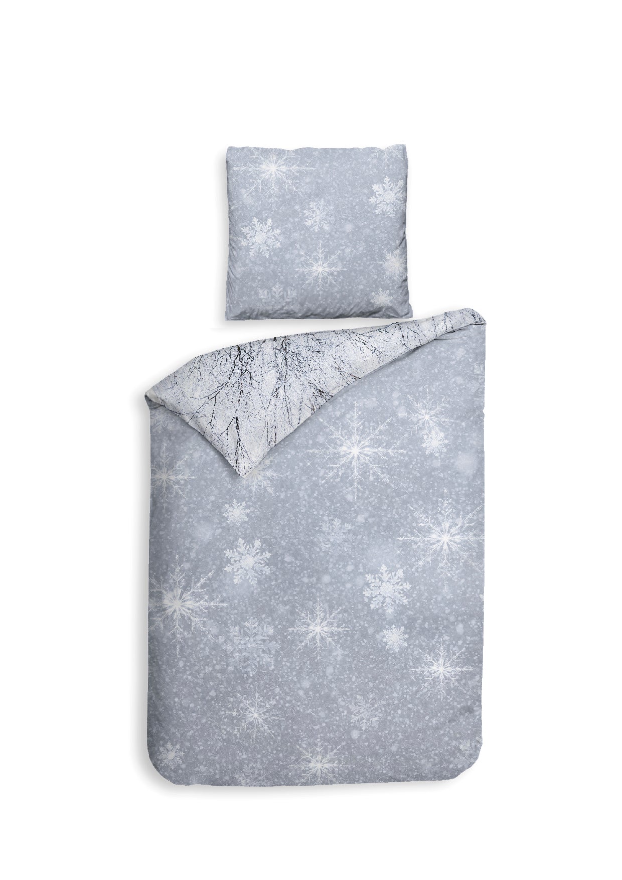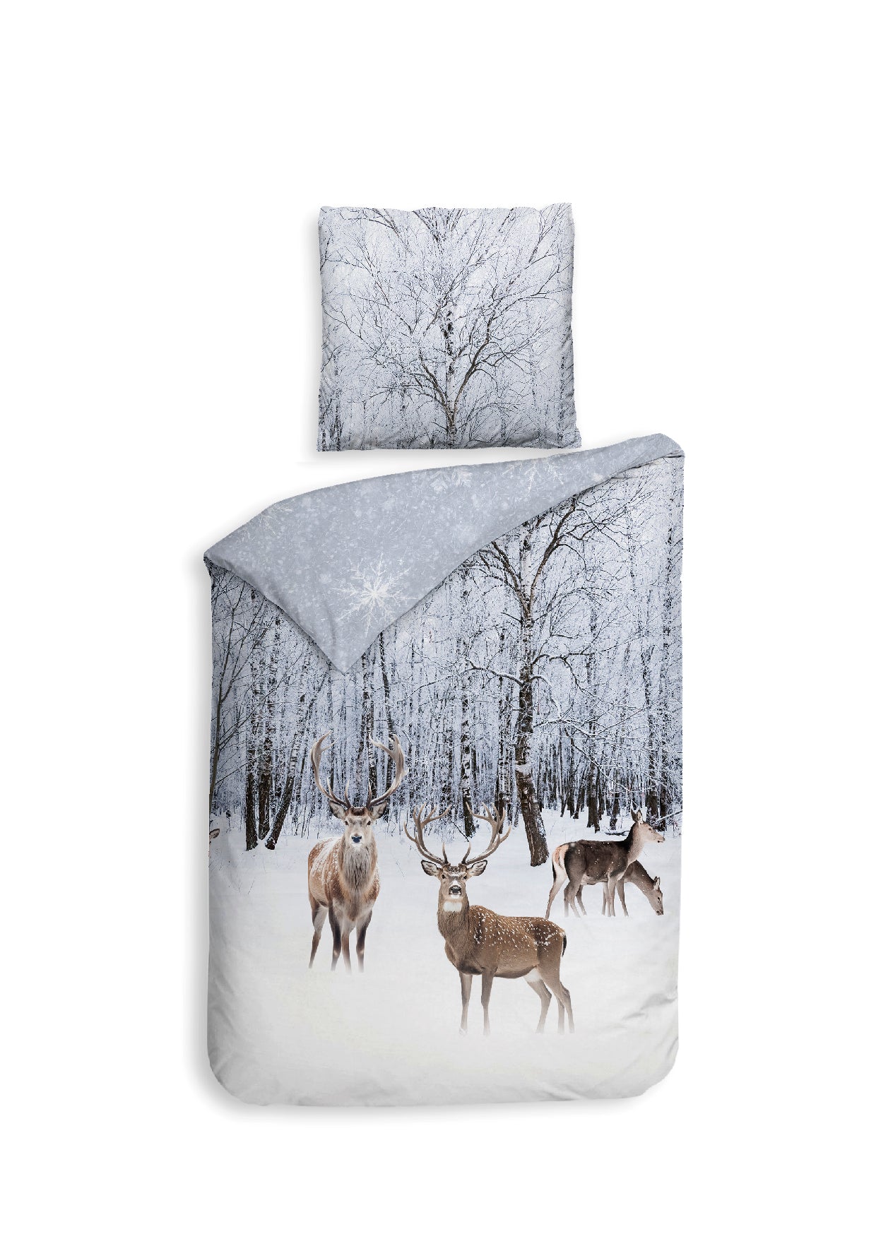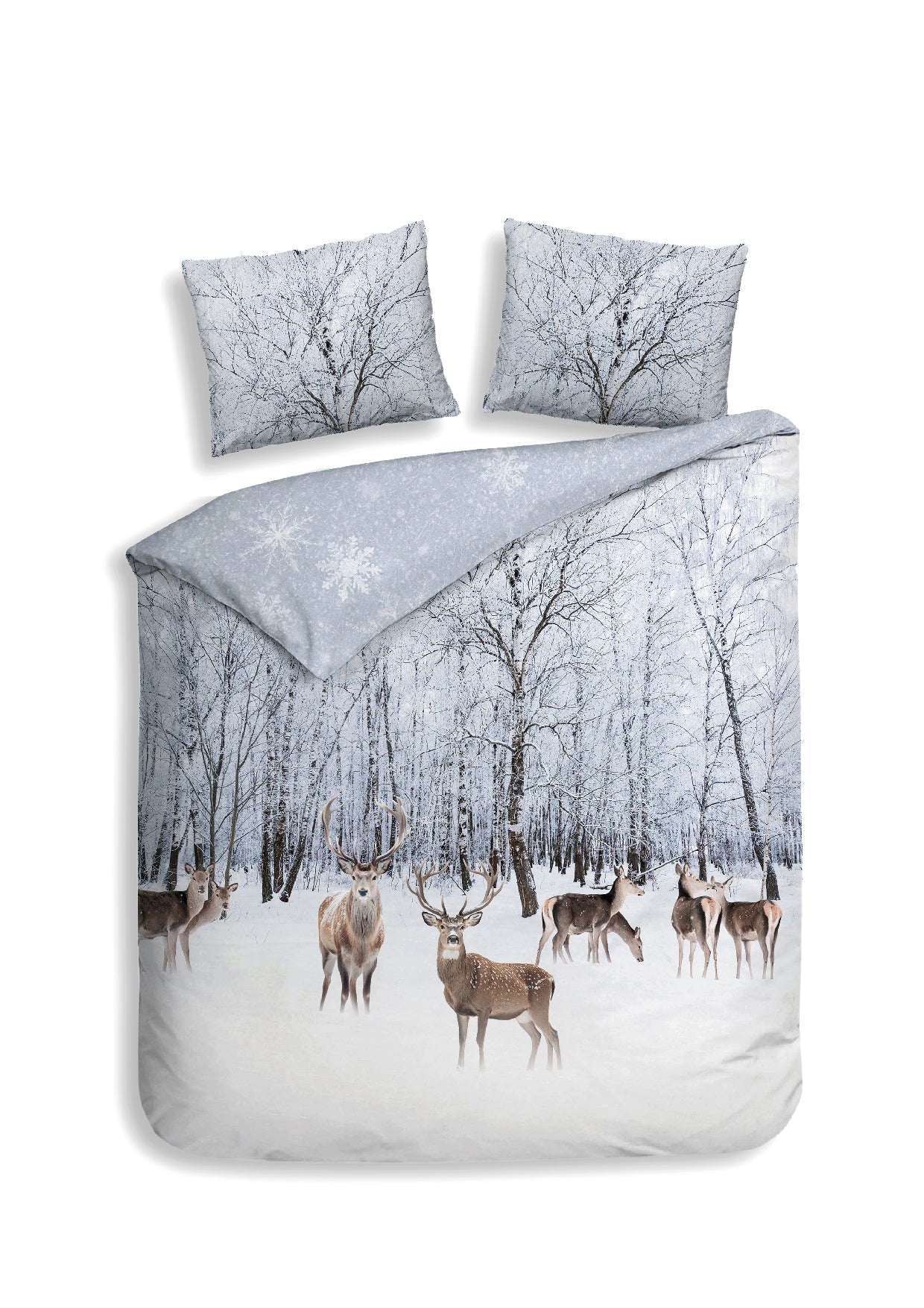 Het Pelle dekbedovertrek van Heckettlane brengt een winters bos tot leven met rendieren in de sneeuw en een achterzijde vol zachte sneeuwvlokken. Gemaakt van 100% katoen-satijn voelt het heerlijk zacht aan en zorgt het voor een knusse, luxe slaapervaring. Perfect voor wie warmte en stijl wil combineren in de slaapkamer.